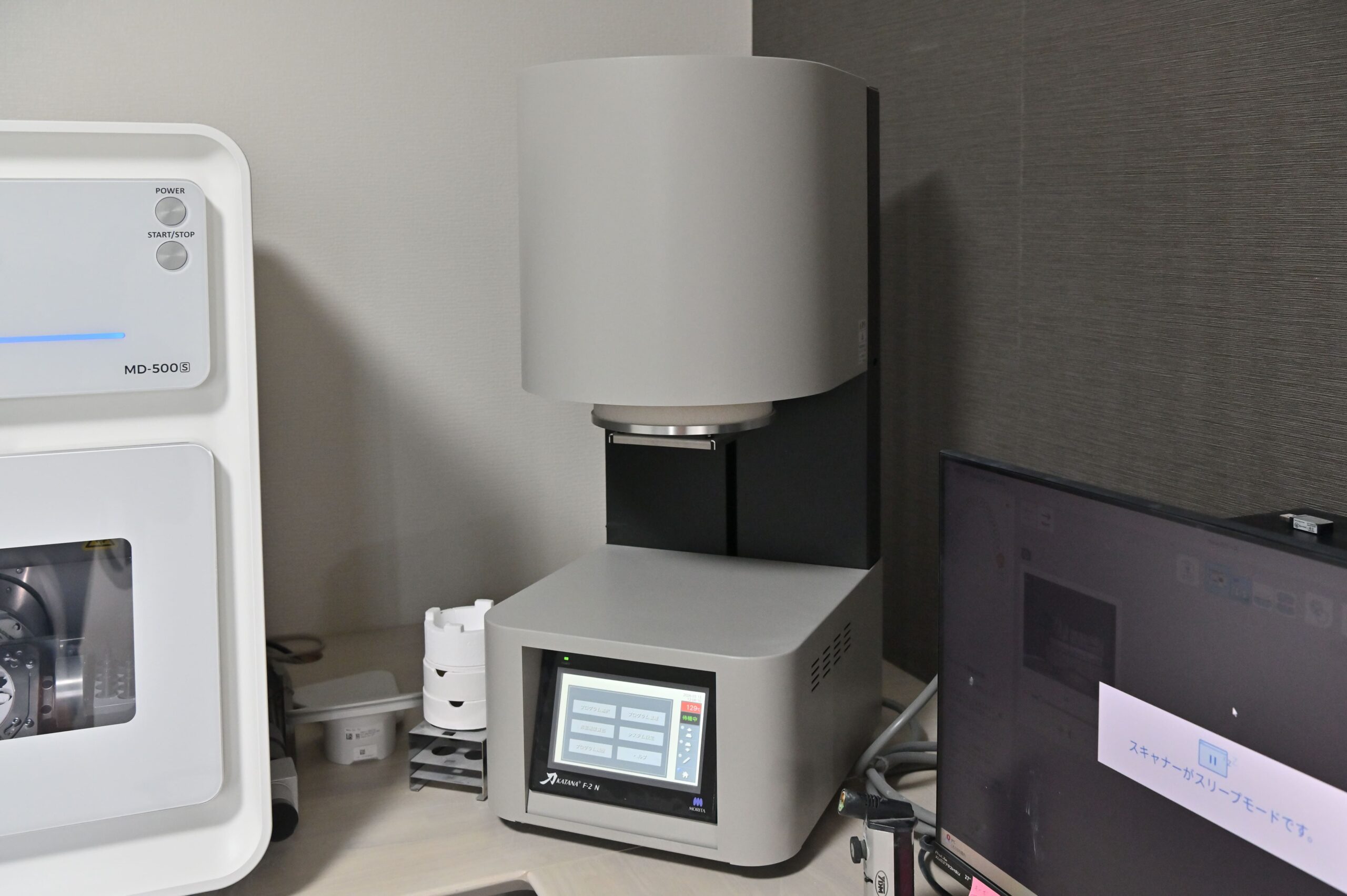 設備 シンタリングファーネス 素材を完成させる「最終仕上げの熱処理」 主にジルコニアなどの素材を、超高温(1,500℃前後)で長時間焼き締めるための専用炉です。この工程を経ることで、素材は本来の硬さと白さを手に入れ、お口の中で機能する強靭な歯へと生まれ変わります。